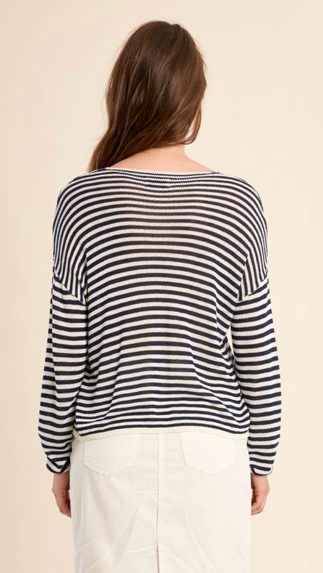 The BRI Striped Sweater is your go-to layering piece for unpredictable spring weather. Crafted in a super lightweight knit, this navy and white striped v-neck transitions effortlessly from casual to polished. Throw it over a dress for an instant refresh, or pair it with your favorite jeans for relaxed weekend vibes. Perfect for early spring days and chilly beach nights, this closet staple works as hard as you do.