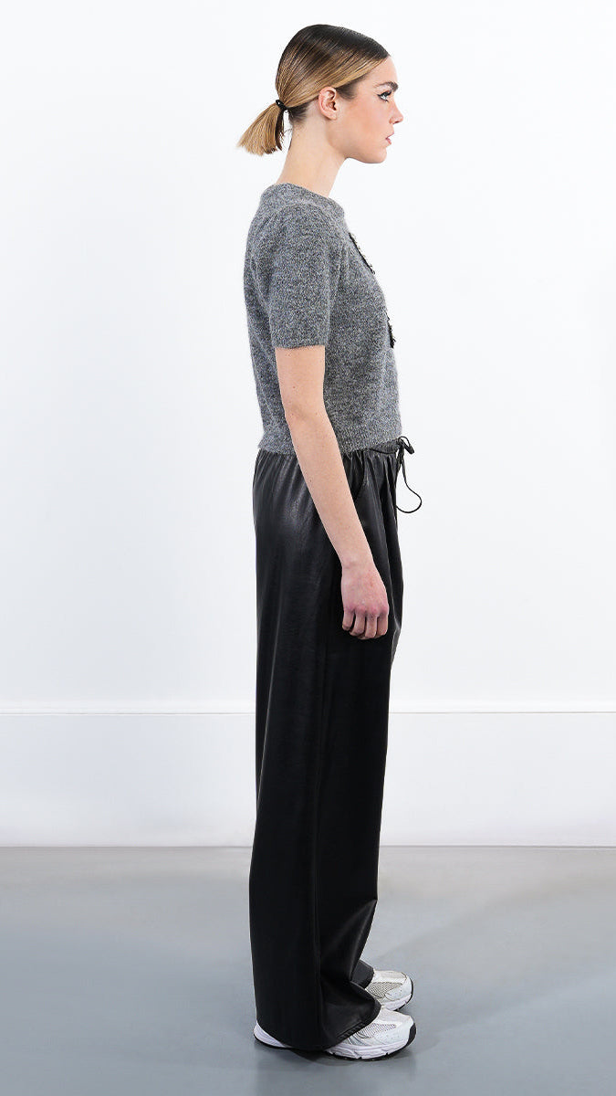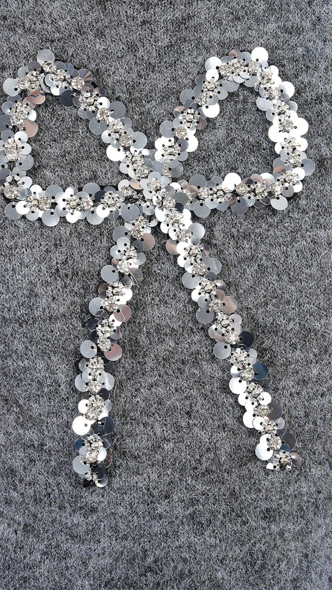 Elevate your holiday wardrobe with this charming short-sleeve sweater, featuring an eye-catching silver sequin bow that transitions seamlessly from casual gatherings to formal celebrations. The soft, comfortable knit fabric ensures all-day wearability, while the statement bow detail adds just the right amount of festive sophistication. Perfect for layering or wearing solo, this versatile piece captures the spirit of the season with understated elegance.