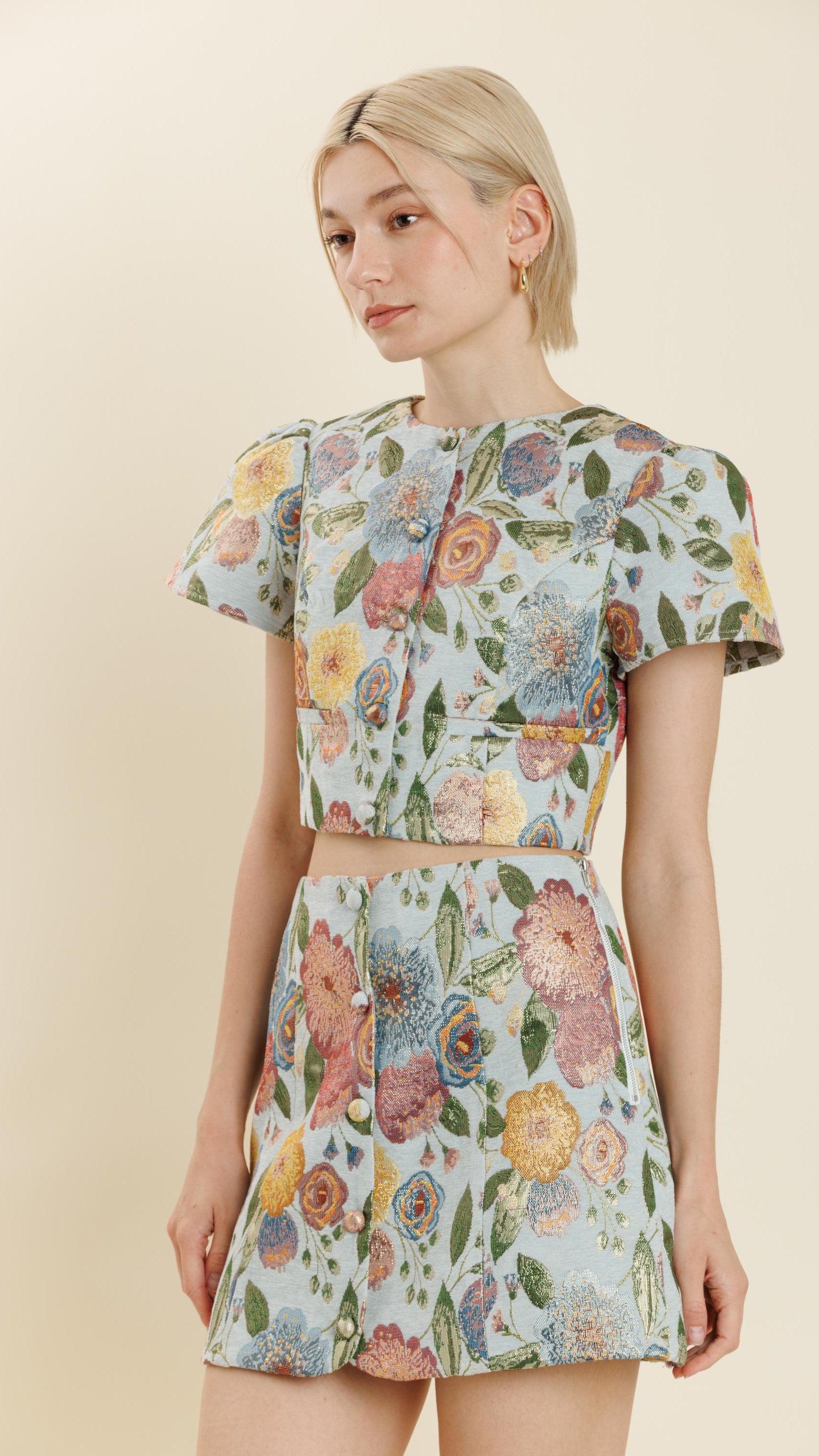 The CIDNEY FLORAL SKIRT showcases an exquisite floral jacquard weave that captures light beautifully with its subtle shimmer. This versatile piece transitions effortlessly from casual daytime looks to elegant evening ensembles, making it an essential addition to your holiday wardrobe. The intricate floral pattern adds sophisticated dimension while the lustrous finish elevates any outfit. Whether paired with a simple tee for understated charm or dressed up with a silky blouse for special occasions, this skirt delivers refined style and timeless appeal.