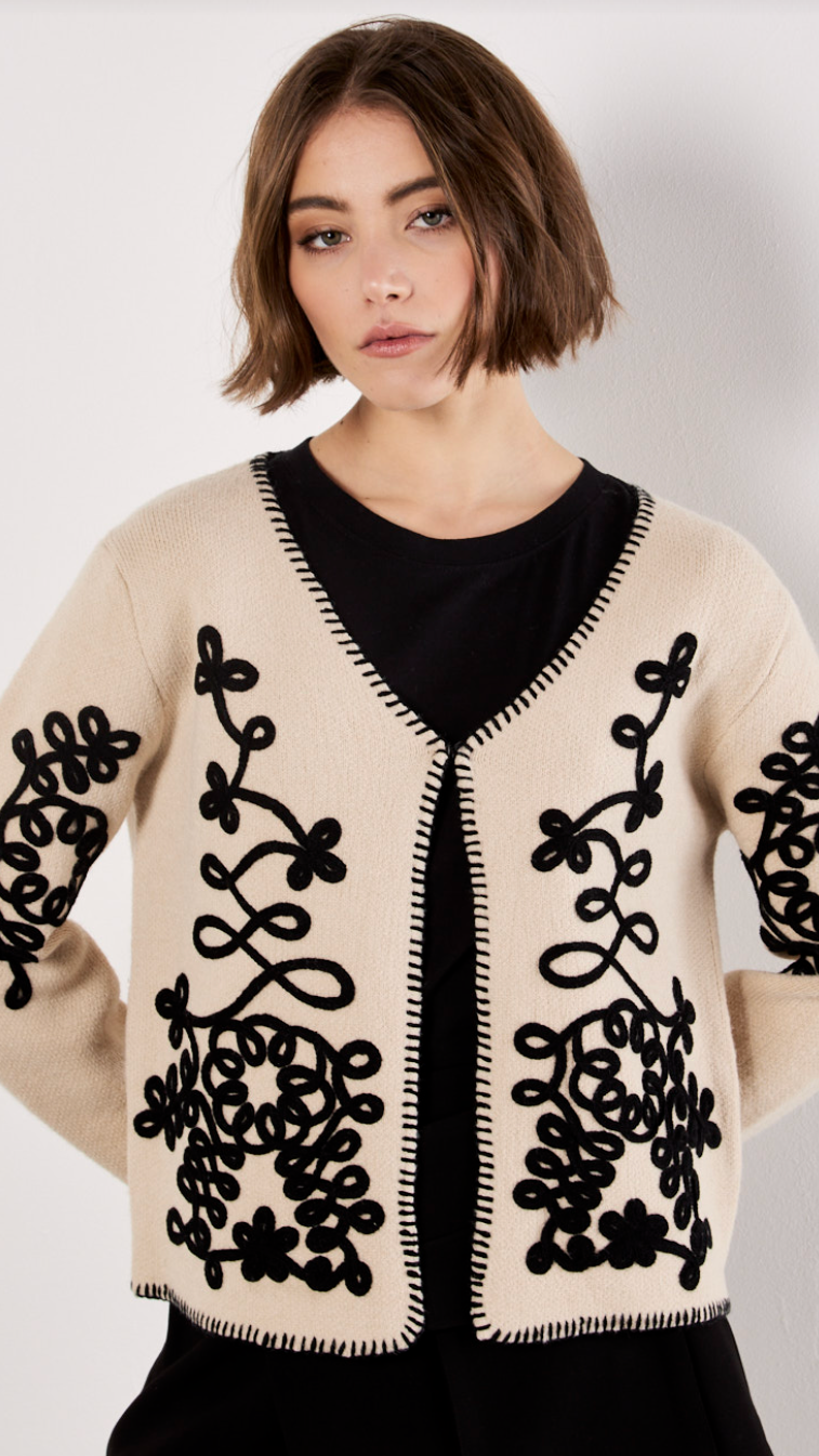 The Ember Cardigan by Apricot features a sophisticated cream base with delicate black embroidered detailing, offering an elevated style perfect for fall. Its north v-neck design allows for versatile layering—dress it up or down to suit any occasion. This piece blends comfort with refinement, making it an essential addition to your autumn wardrobe.
