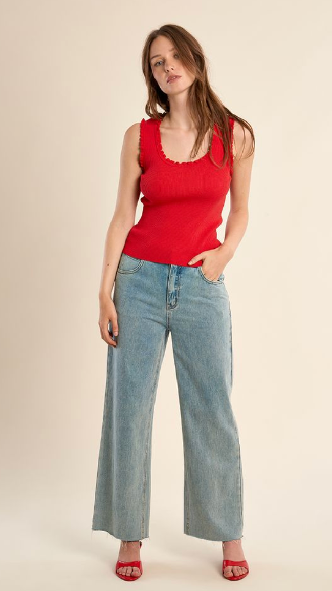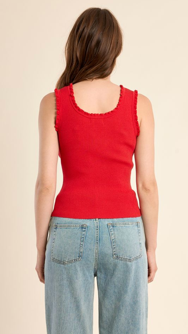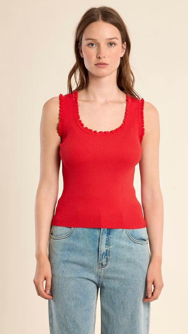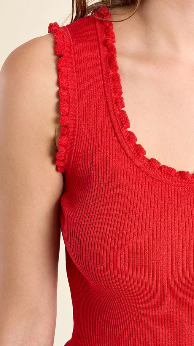 The GENA TANK features a charming ruffle squareneck design that adds feminine flair to your everyday wardrobe. Crafted from soft, breathable knit material, this tank offers comfort and effortless style. The stunning red color makes a bold statement while remaining versatile enough to pair with your favorite bottoms. Perfect for layering or wearing solo, this piece transitions seamlessly from casual days to evening outings.