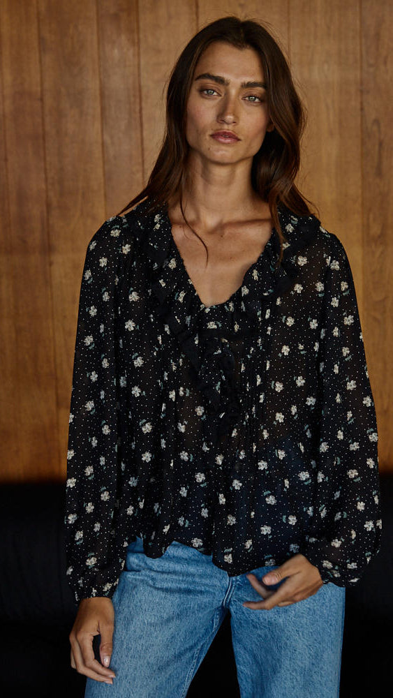This lightweight blouse features a charming ruffle front and an adorable floral pattern, perfectly capturing the cozy spirit of fall. Its versatile design allows you to easily dress it up for a polished look or dress it down for casual wear, making it a stylish and practical addition to your seasonal wardrobe.