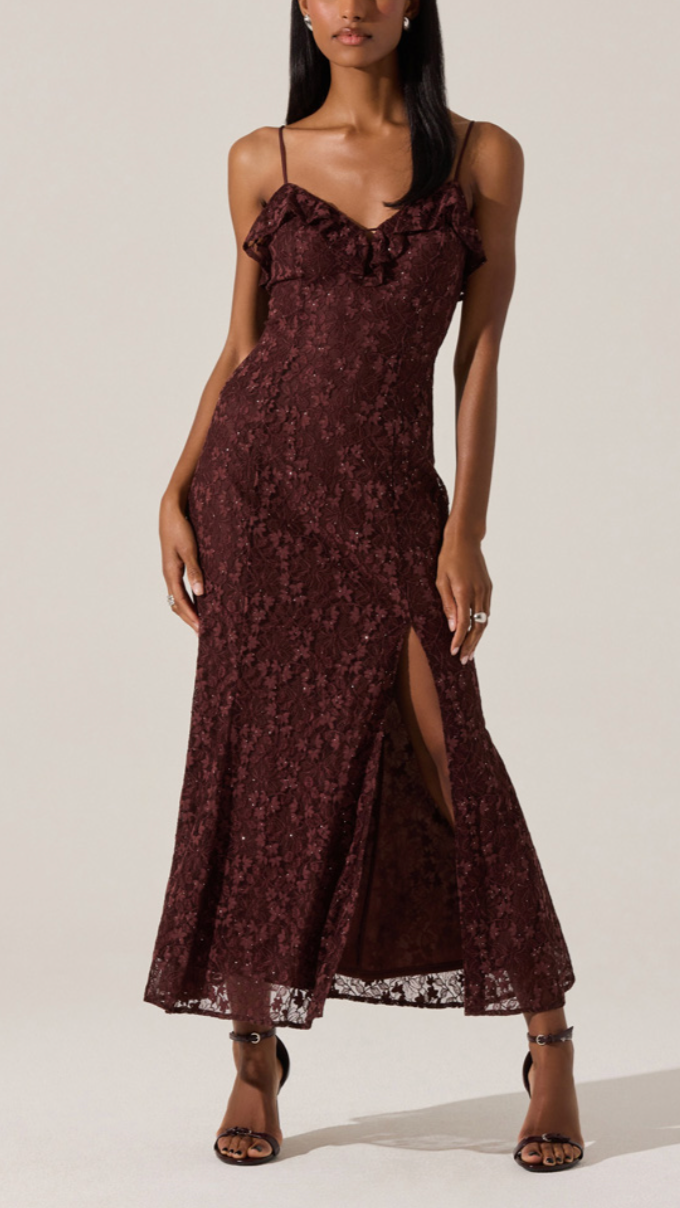 The Leonie Dress by ASTR the Label offers an elegant midi silhouette enhanced by a subtle shimmer that catches the light beautifully. Designed with adjustable spaghetti straps and a flattering ruffle V-neckline, this dress combines delicate detailing with feminine sophistication. A side slit adds effortless movement, making it an ideal choice for both daytime events and evening occasions.