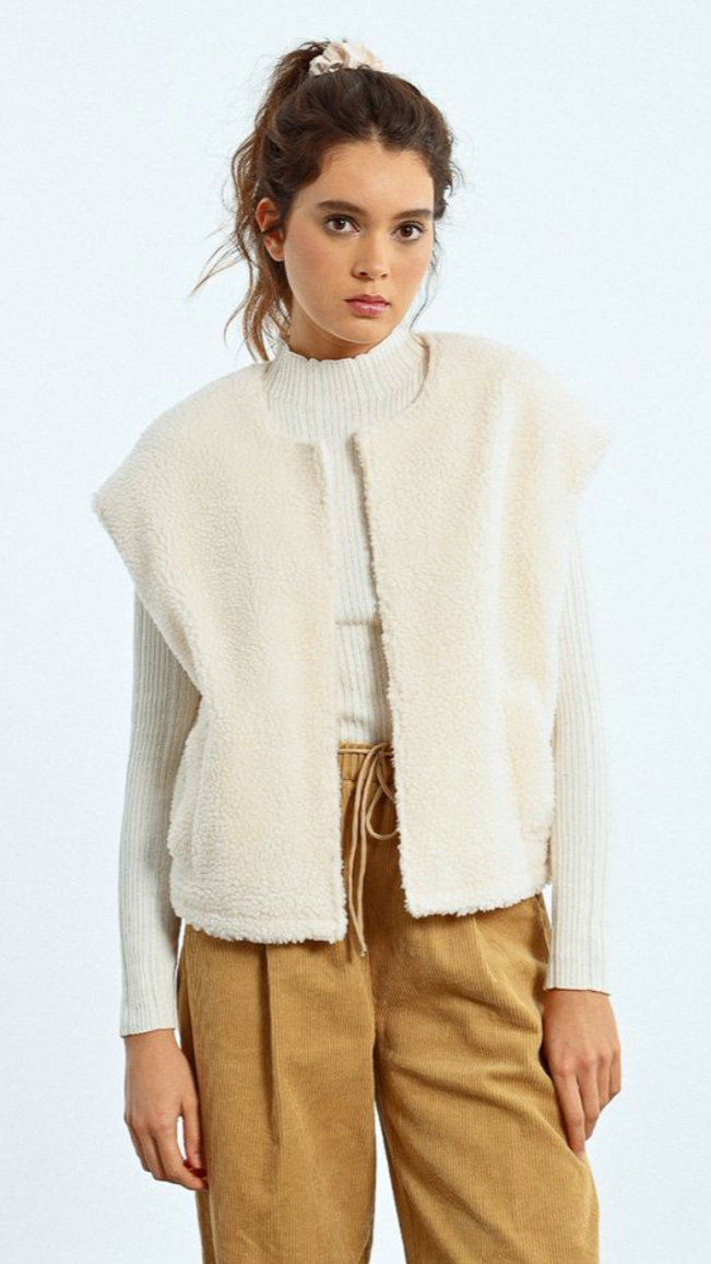 The LOUISE VEST, crafted from cozy Sherpa fleece, offers versatile style for both casual and refined looks. This soft vest is ideal for layering during fall and winter, providing warmth without bulk. Its adaptable design makes it an essential piece that seamlessly transitions between outdoor activities and more polished occasions.