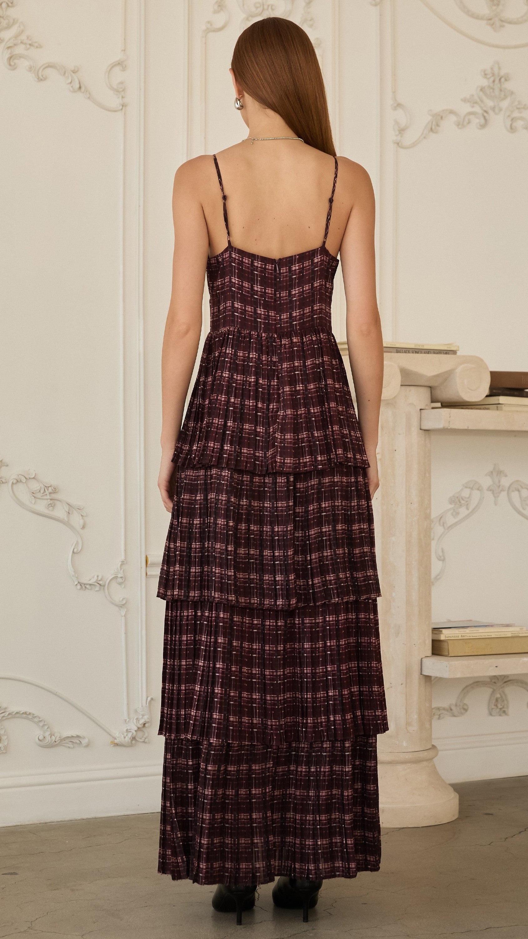 Elevate your holiday wardrobe with this striking plaid maxi dress, designed to turn heads at every festive gathering. The flattering V-neckline pairs beautifully with delicate straps, while cascading ruffled tiers create movement and dimension throughout. Perfect for seasonal celebrations, this dress combines timeless plaid styling with modern silhouette details for an effortlessly sophisticated look that transitions seamlessly from holiday parties to special occasions.