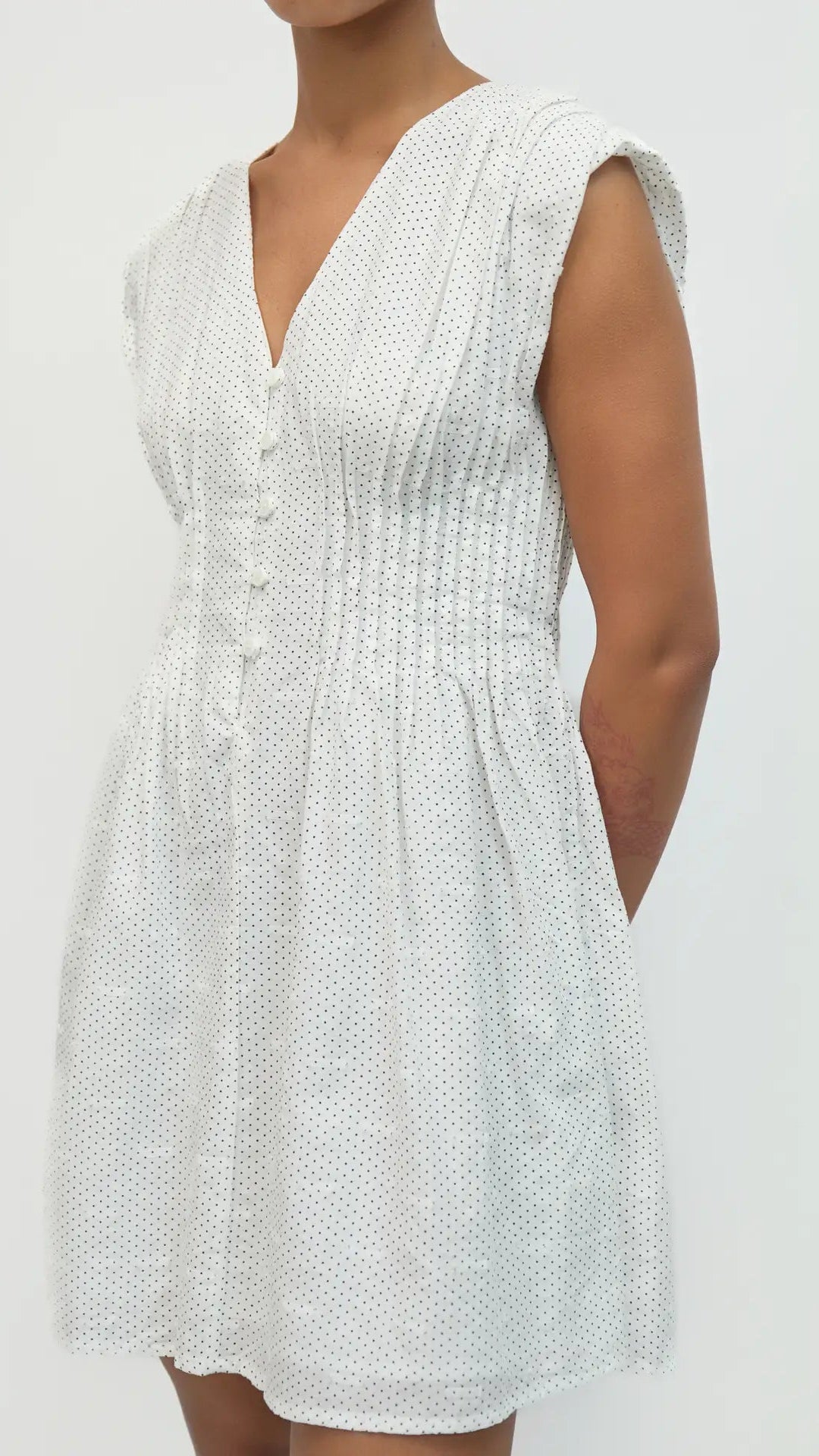 The Hollie Dress is a stunning lightweight piece that effortlessly transitions from day to night. Featuring a subtle polka dot pattern, flattering V-neckline, and button-front closure, this dress cinches at the waist for a beautifully defined silhouette. The versatile design dresses up or down, making it perfect for any occasion. Comfortable enough for everyday wear yet polished enough for special moments.